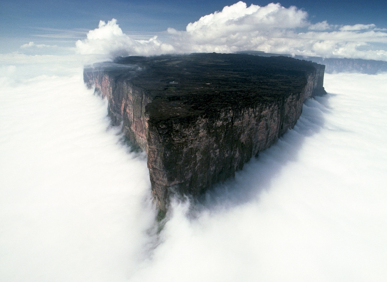 Mount Roraima Venezuela: Mount Roraima also known as Tepuy Roraima and Cerro Roraima is the highest of the Pakaraima chain of tepui plateau in South America. First described by the English explorer Sir Walter Raleigh in 1596, its 31 km2 summit area is defended by 400-metre-tall cliffs on all sides. The mountain includes the triple border point of Venezuela, Brazil and Guyana. Mount Roraima lies on the Guiana Shield in the southeastern corner of Venezuela's 30000 km2 Canaima National Park forming the highest peak of Guyana's Highland Range. The tabletop mountains of the park are considered some of the oldest geological formations on Earth, dating back to some two billion years ago in the Precambrian.